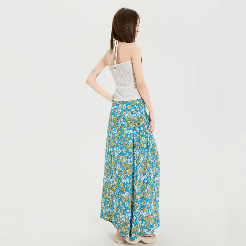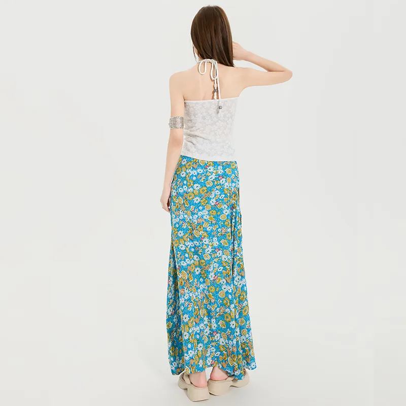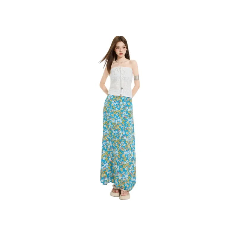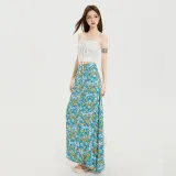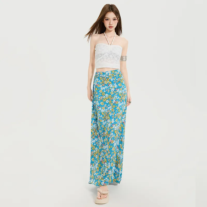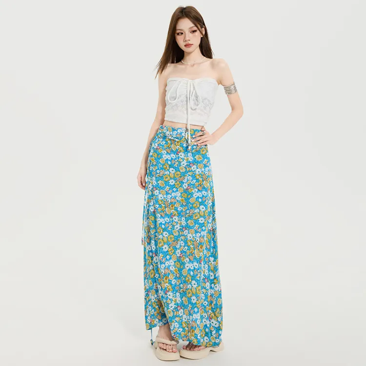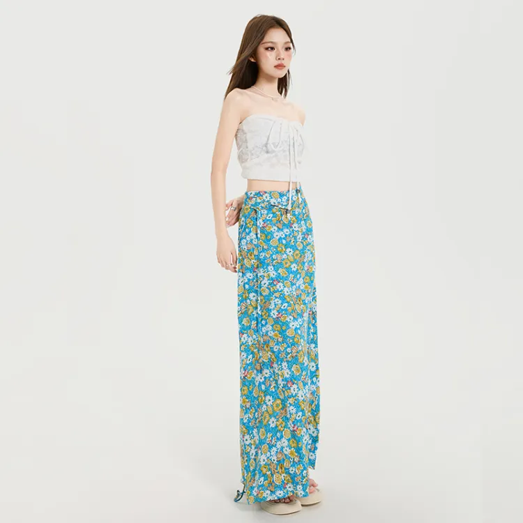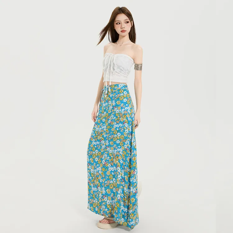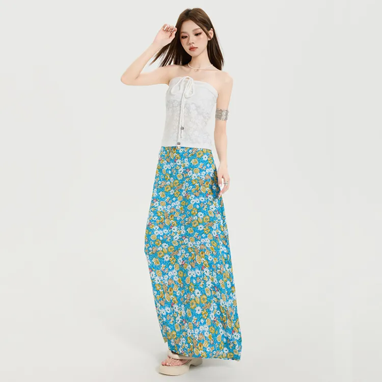Комплект:Белый топ без бретелей с цветочным принтом и юбка