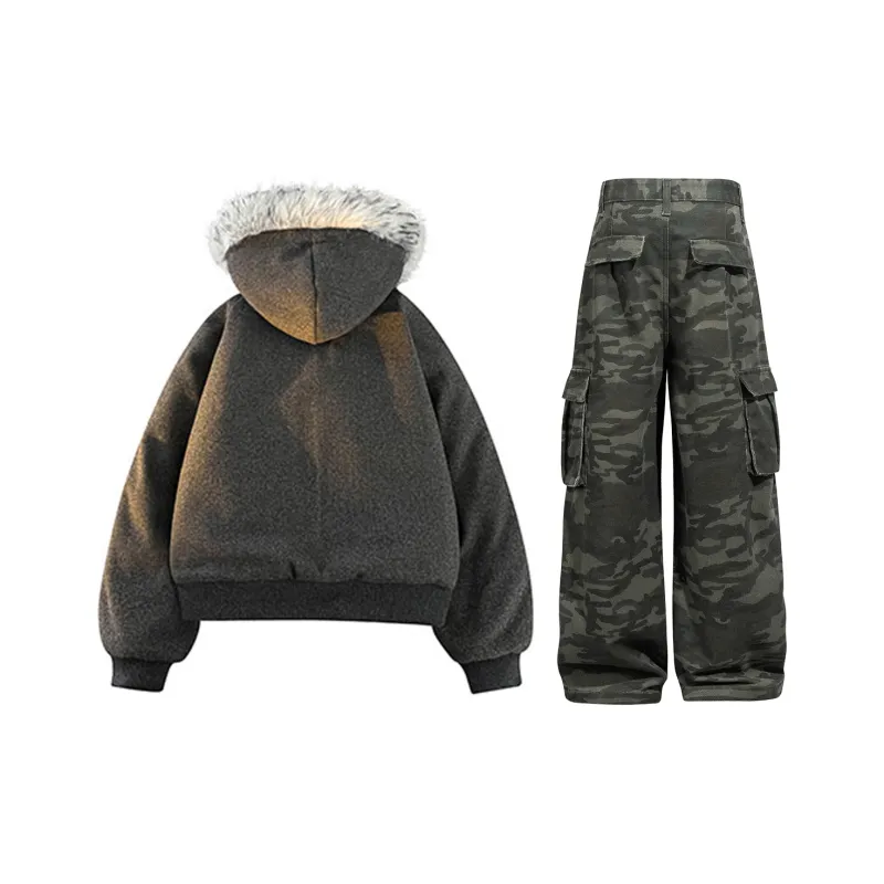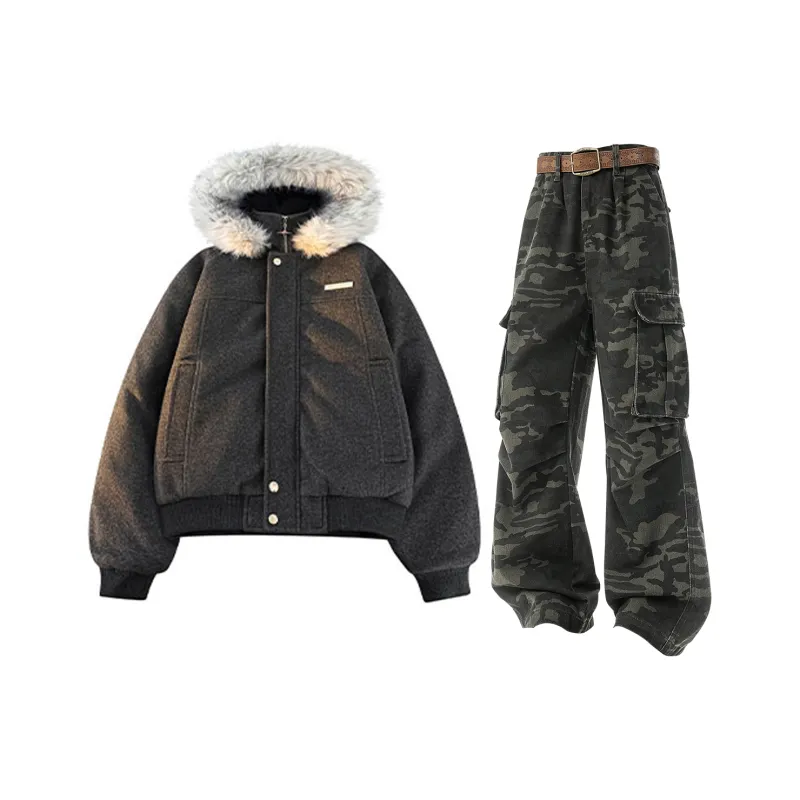 Комплект:Темно-серое пальто + камуфляжные джинсы